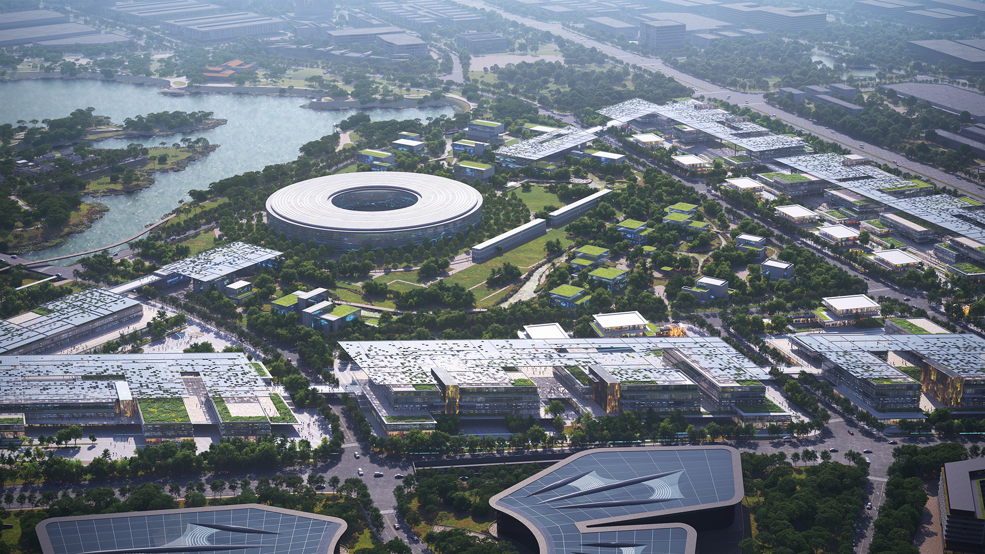 Behind it, along the lakeshore, a constellation of seven elements – commercial complex, innovation community, cultural district, creative workshops, hotels, and apartments – is arranged in a ‘Stars Surrounding the Moon’ formation, creating a functionally mixed and dynamically interwoven innovation neighborhood.