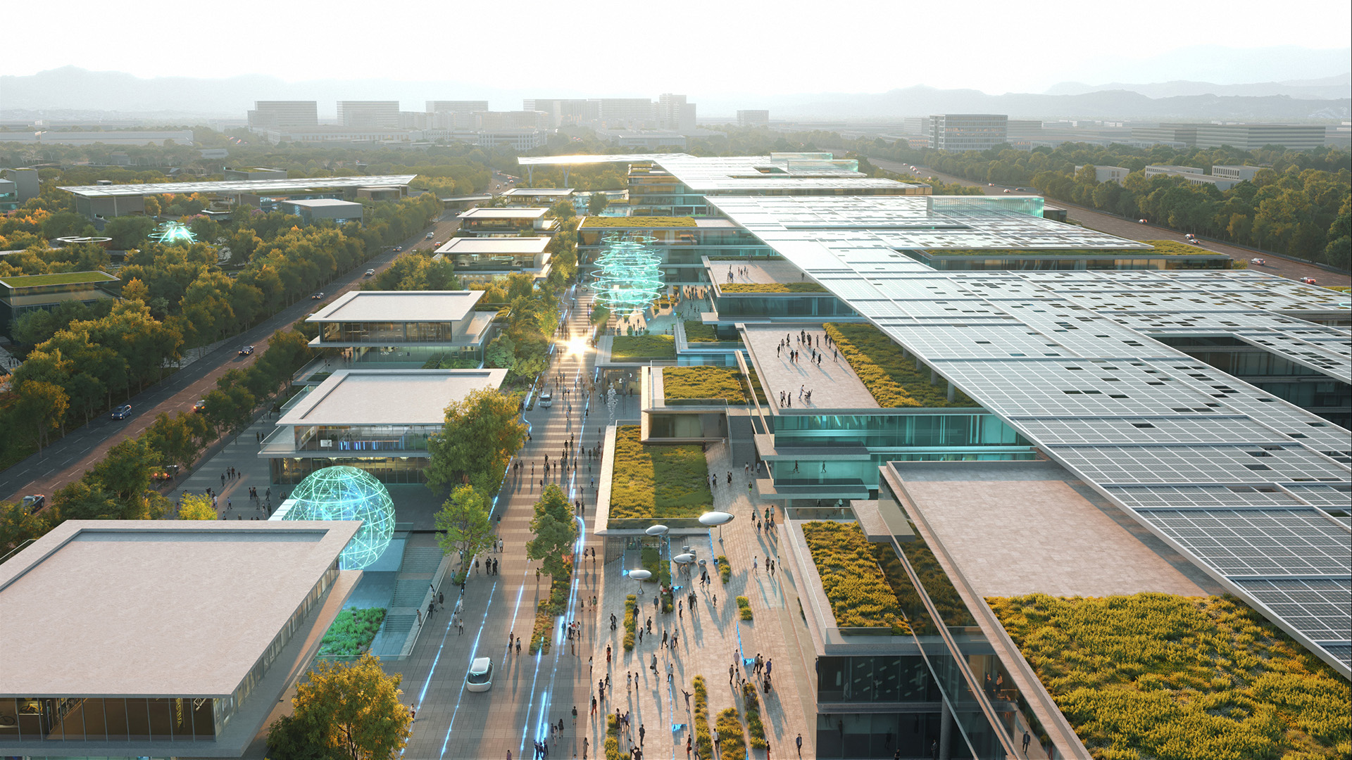 The project employs nine specialized technical systems to ensure high-quality delivery. Among these, the integrated roof system stands as a core signature where technology meets aesthetics. The large-scale solar photovoltaic panels covering the building clusters not only create a highly futuristic form but also combine multiple functions: shading, passive ventilation, concealment of MEP equipment, and nighttime illumination. After dark, these roofs transform into distinctive luminous landmarks, tracing the captivating skyline of the Jinyi Lake Source of Science and Technology Innovation.
